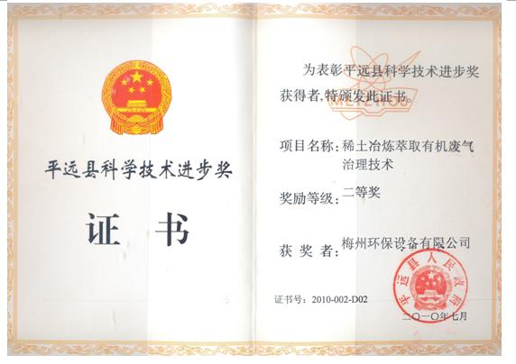 为了表彰在推动平远县科技进步、促进经济和社会发展中做出贡献的单位和个人,进一步激励和调动广大科技工作者的积极性和创造性,提高平远县科技进步水平,促进科技与经济紧密结合。根据县政府《关于印发平远县科学技术进步奖励办法的通知》(平府发[2006]16号)规定,经平远县科技进步奖评审委员会设疑通过,决定授予我公司与平远县环境保护监测站合作的“稀土冶炼萃取有机废气治理技术”项目为县科技进步奖二等奖。